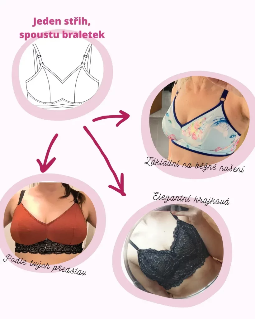 - Vyzkoušíš si jednoduché úpravy střihu tak, aby braletka vypadala pokaždé úplně jinak. Díky tomu budeš šít braletky, které ti perfektně padnou a přitom nevypadají stejně.
